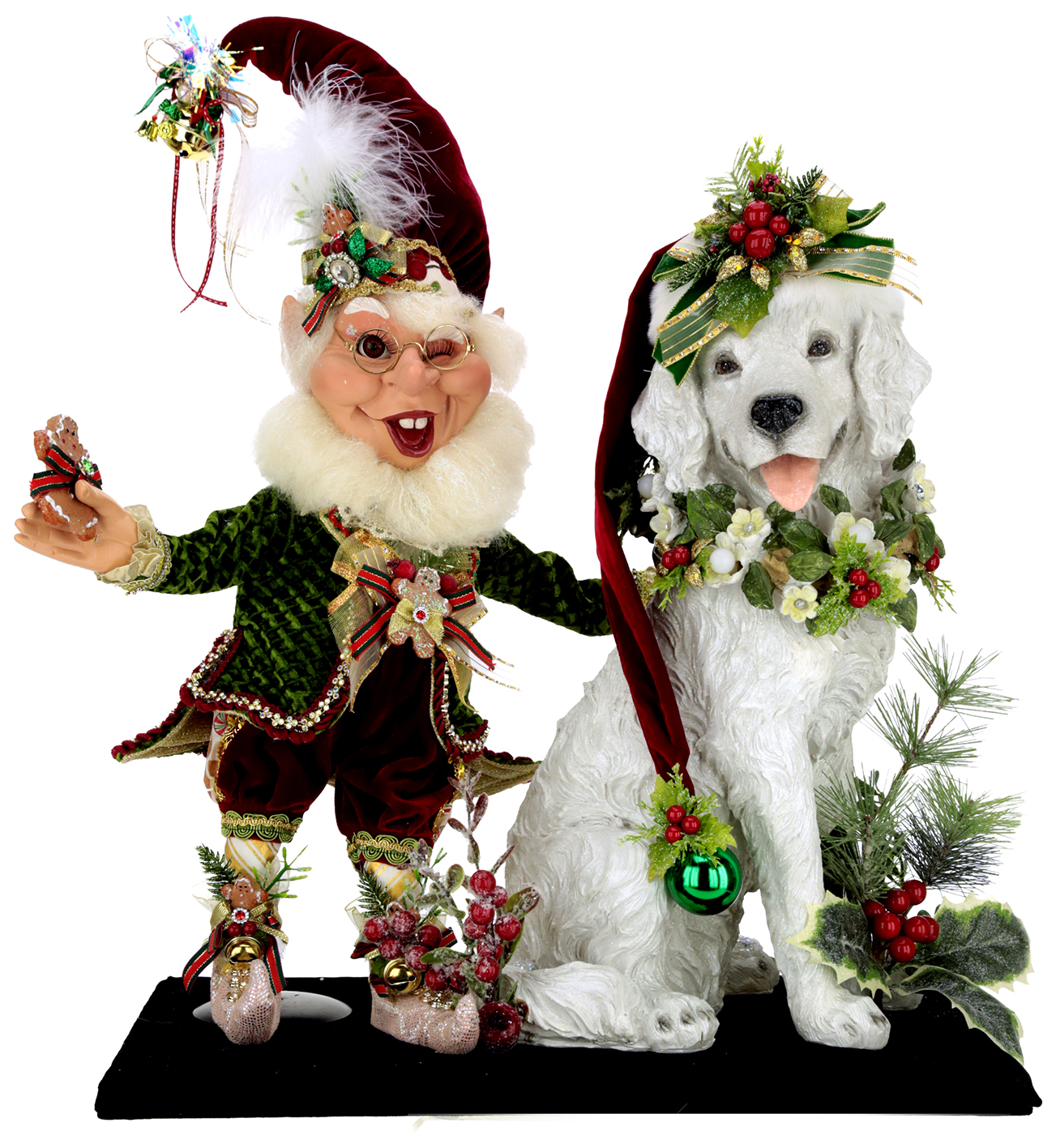 Bring home the playful charm of classic seasonal artistry with this Mark Roberts Cookies and Milk Elf with Dog, designed in a few-of-a-kind style with the rare detailing that Mark Roberts creations are known for. Standing 19.5 inches tall, this expressive figure blends rich layered fabrics, spirited cookie and milk accents, and warm character details that make the scene feel alive. The cheerful elf is joined by a loyal dog companion, creating a lively storybook moment that adds depth and personality to any festive display.