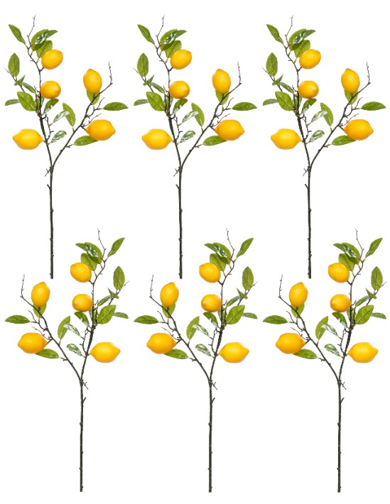 This decorative lemon branch set features six stems of vibrant yellow lemons, each stem displaying five lemons nestled among lush green leaves for a fresh, natural look. The realistic detailing adds bright color and texture to floral arrangements, centerpieces, or seasonal décor. Perfect for creating a cheerful, citrus-inspired display in any home or event setting