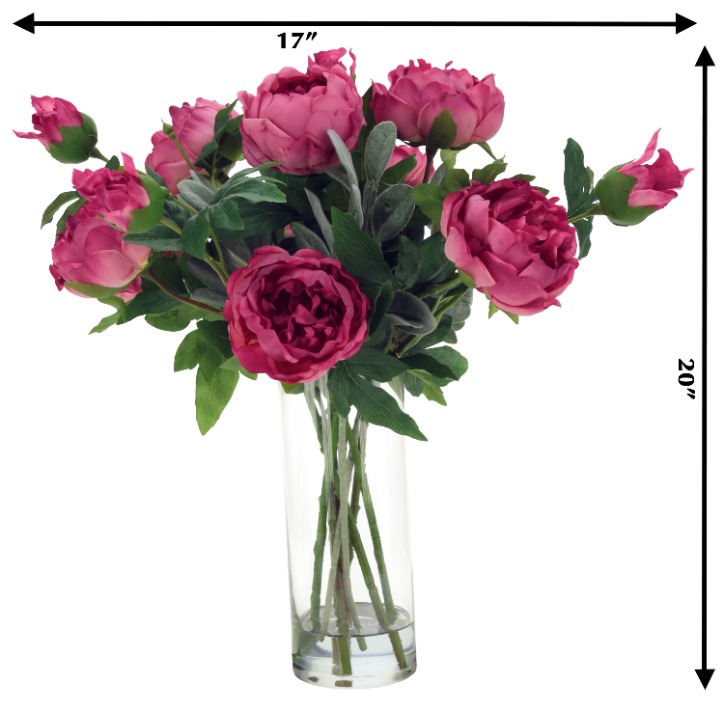 This stunning arrangement features 10 rich rose-colored peonies & 4 buds with full, layered petals that create a bold and elegant display. Lush green foliage and soft accent leaves enhance the natural beauty of the blooms. Presented in a clear glass vase, it adds a vibrant and sophisticated touch to any room or tabletop décor