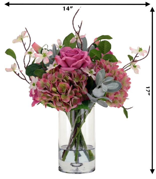 This elegant arrangement features 4 soft pink roses and 3 lush hydrangea blooms beautifully complemented by delicate blossoms and greenery. Textured foliage and natural branches add depth and a graceful garden-inspired look. Displayed in a clear glass vase, it creates a charming and sophisticated accent for any room or tabletop décor.