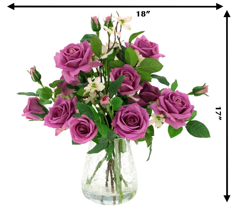 This beautiful arrangement features 12 elegant lavender roses & 6 buds with delicately layered petals that create a soft, romantic look. Fresh green foliage and small accent blossoms add natural texture and charm to the display. Presented in a crackled glass vase, it brings a graceful and sophisticated touch to any room or tabletop décor.
