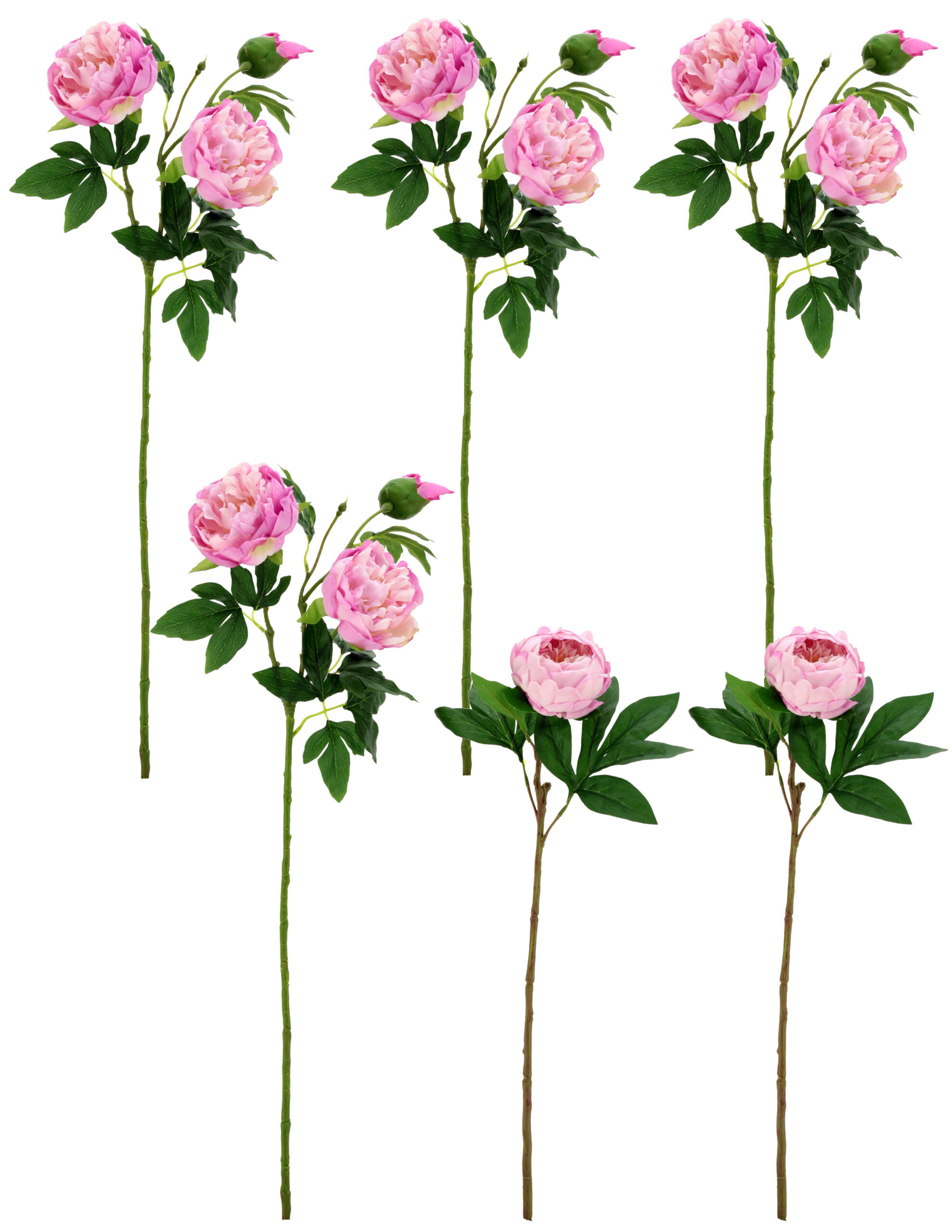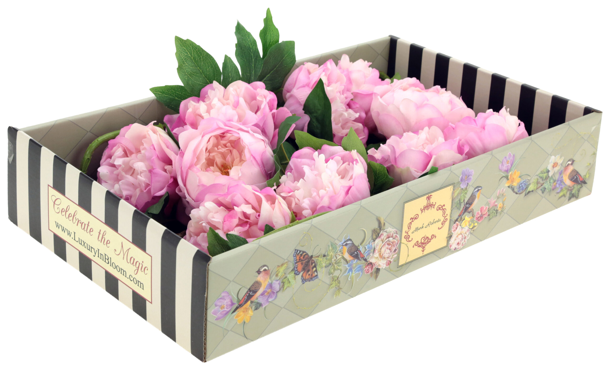 The Mark Roberts Lavender Ruffled Peony Natural Touch stems are beautifully designed artificial peonies featuring softly ruffled petals that closely resemble the look and feel of fresh blooms. Each box contains six stems with a natural-touch finish and varying heights from 23" to 32", creating a full, garden-inspired display. Four stems feature two large flower heads and a bud, while two stems showcase a single large bloom. Perfect for floral arrangements, bouquets, or decorative displays, these lifelike peonies add elegant color and texture without the upkeep of real flowers. All stems are presented in a beautiful Mark Roberts keepsake gift box with an acetate top