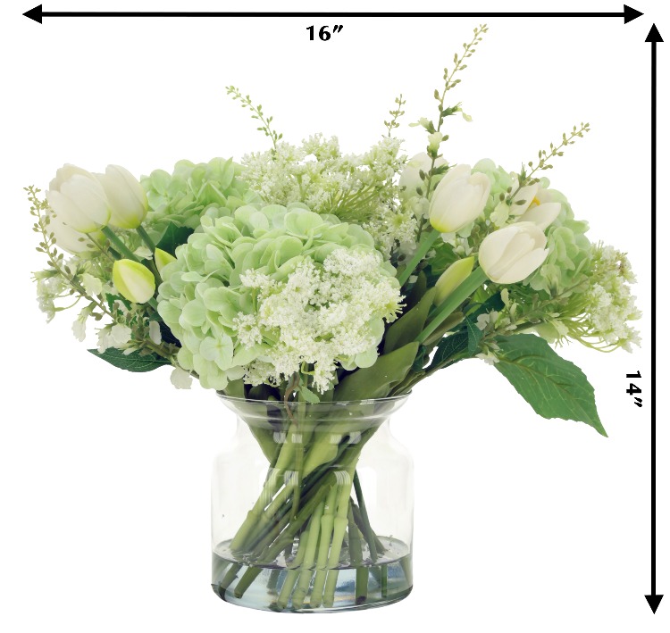 This elegant arrangement features 3 soft green hydrangea blooms paired with delicate white florals and 15 graceful tulips. Lush greenery adds natural texture and fullness to the fresh, garden-inspired design. Displayed in a clear glass vase, it brings a serene and sophisticated touch to any home or tabletop décor