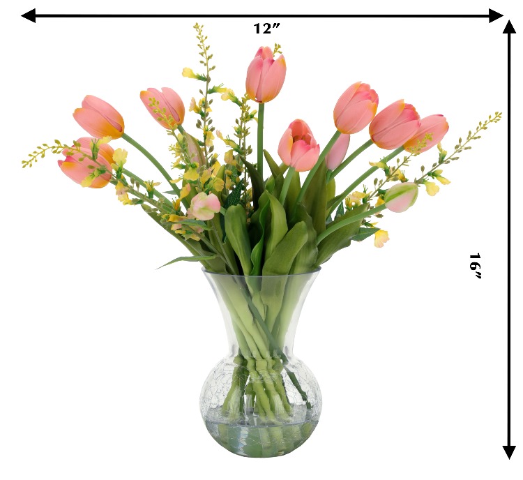 This charming arrangement features 15 soft peach tulips (9 full flowers and 6 about to bloom buds) accented with delicate yellow blossoms and lush green foliage. The fresh, spring-inspired colors create a bright and uplifting display. Arranged in a clear glass vase, it adds a cheerful and elegant touch to any tabletop or home décor.
